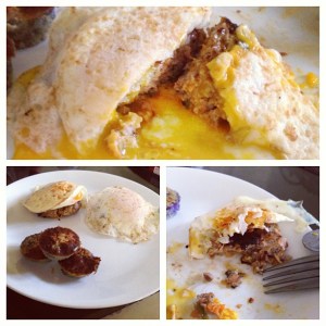 – In another skillet cook your eggs the way you like them, I love my eggs bleeding so that’s what I did! Just place on top of sausage (if desired) and TA DA!!!