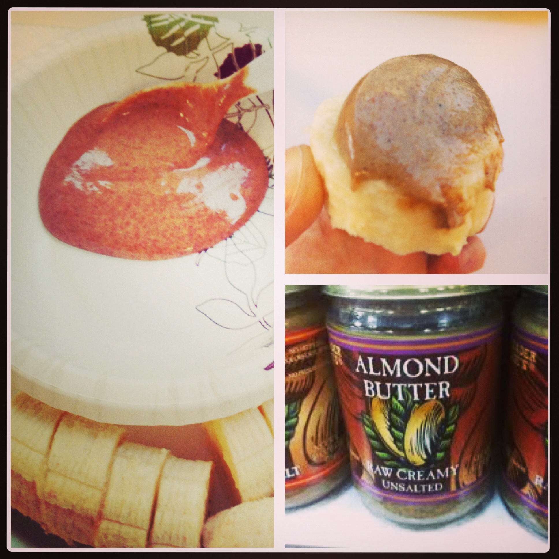 Cut the banana in little pieces as shown in the picture above and use your spoon to place a little scoop on top of each slice.