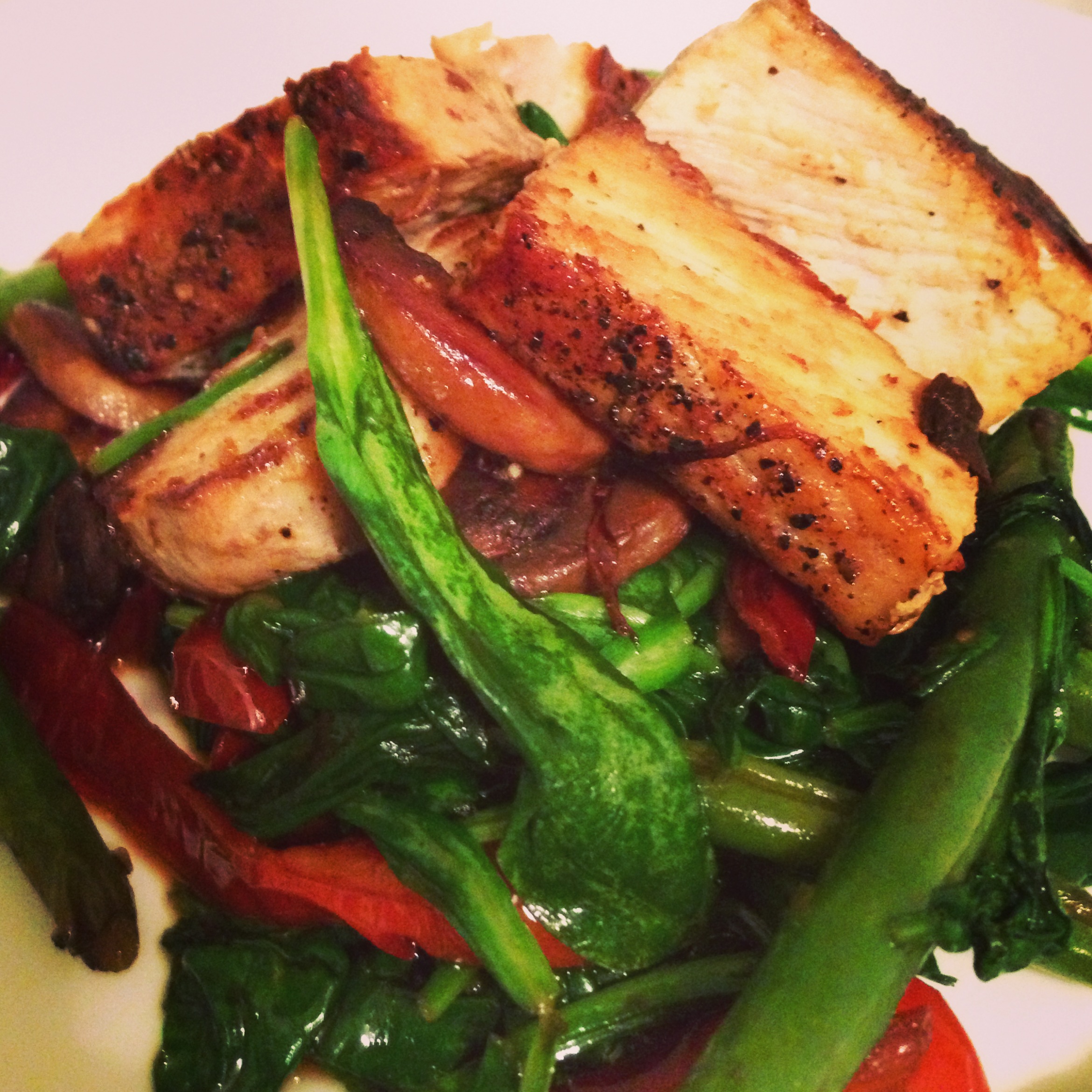 While the pork is cooking add the peppers, mushrooms, spinach and green beans and sautee together. Add more coconut oil, if necessary.
