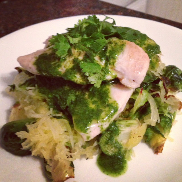 5) Mix the spg squash and brussels together, place the chicken on top and top it off with the Cilantro/Lime pesto.