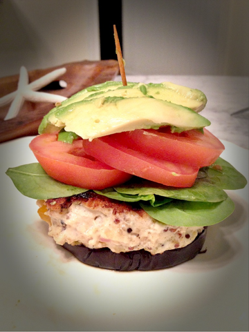 How to stack – use the eggplant as the “bun” and stack the burger on top. Load it up with spinach, tomato, avocado and whatever else you desire!! If you don’t like eggplant, you can always use portabello mushroom or sweet potato! Also another non-paleo nutritional option is Ezekiel bread.