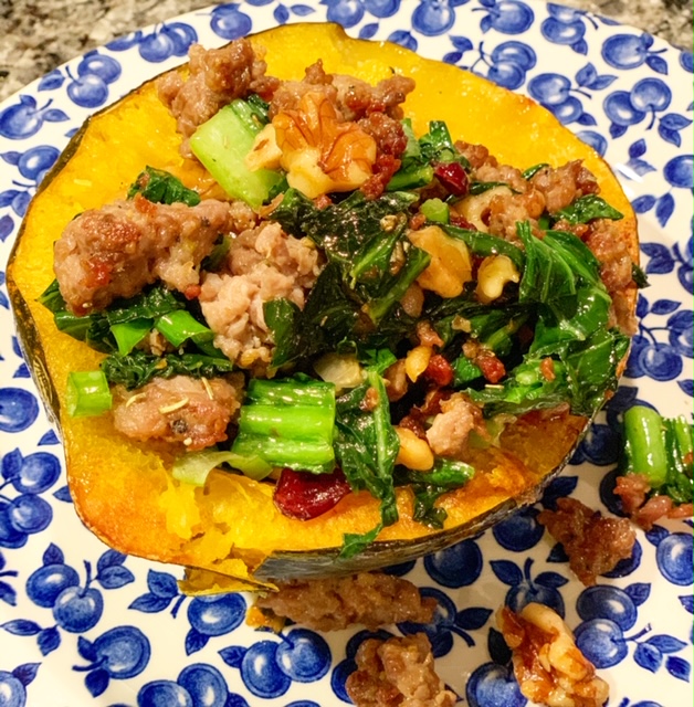 - Using a large spoon, scoop the sausage mixture into the center of the acorn squash.